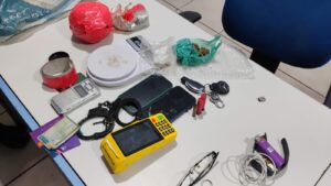 Durante as diligências e revista realizadas pela Polícia Militar, foram encontrados no carro porções de maconha e haxixe, além de uma balança de precisão, um par de algemas, munições e outros materiais.