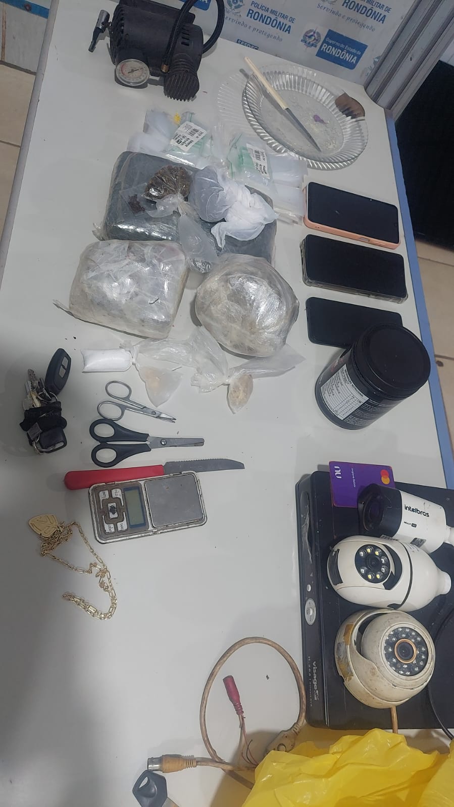 Durante a abordagem, os policiais encontraram tabletes de maconha, crack e porções de cocaína, além de objetos que reforçam a prática do tráfico. Segundo a PM, o imóvel já era conhecido como ponto recorrente de venda de drogas na região, sendo o homem conhecido pelo apelido de “Cabeça” e a mulher chamada de “Ruiva”.